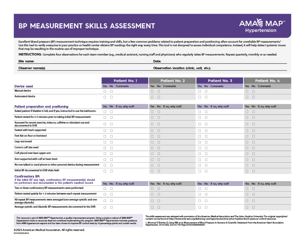 BP Measurement Skills Assessment Checklist of proper positioning and procedures for in-office BP measurement for training care team members on blood pressure measurement protocols. Clinical Process Clinical Team Education Hypertension PDF • English • Last updated: 03/05/2025