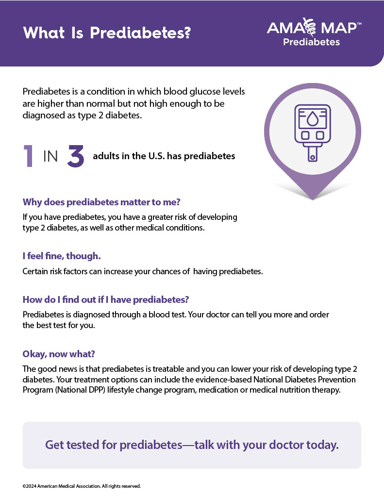 This resource shares information about prediabetes for diagnosed patients and highlights treatment options, including the National DPP lifestyle change program.