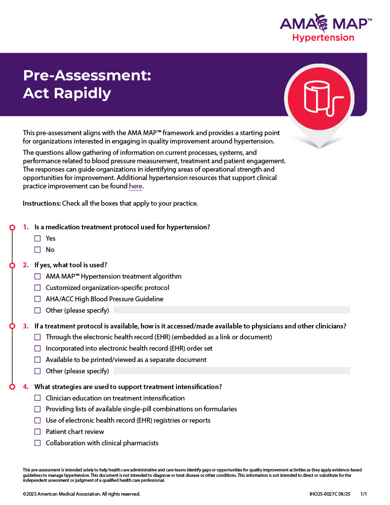 This Partner with Patients pre-assessment aligns with the AMA MAP™ framework and provides a starting point for organizations interested in engaging in quality improvement around hypertension.